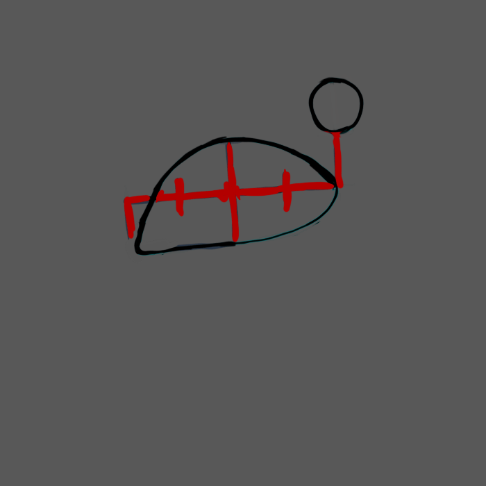 Draw a curve from the corner below the head, going through the top of the guiding cross, and ending at the lower left corner.