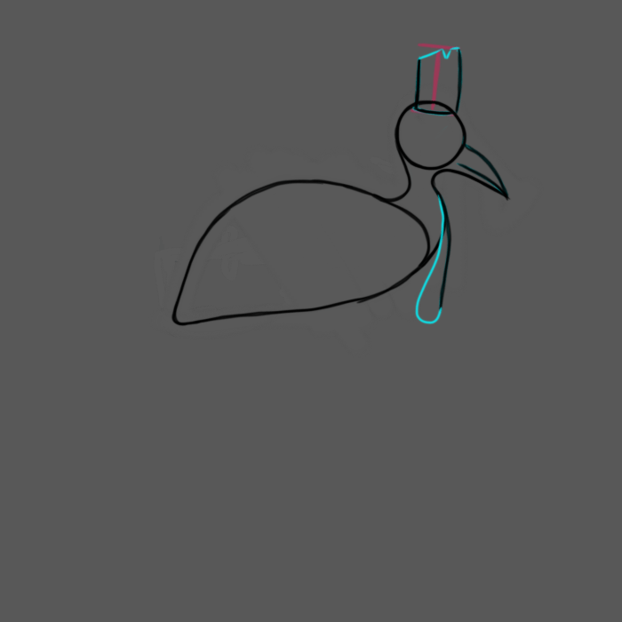 Connect the head to the body with a curve for the back of the neck. For the front of the neck and bottom of the beak; start 1 unit away from the head then draw a distorted S shape that connects the head and the neck. Make sure the bottom of the S curves forwards enough that there’s room for the wattle to hang, but not so much that it looks broken or ungraceful.