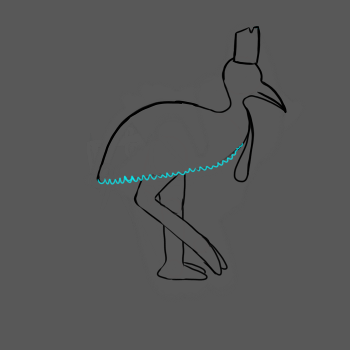 Along where the bottom of the body used to be, draw a scalloped line to indicate shaggy feathers. The feathers are not stiff flight feathers, but droopy and fuzzy like an ostriches feathers or even like fur, so make sure they all point down. Clean up the line with your eraser when you’re done to get rid of any traces of the smooth line or slip ups.