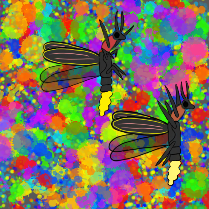 Finally add shading. I did very little white highlights in this, using it mostly on the far wing and the lit one’s eye, and used yellow for highlights everywhere else. On the tail of the non-lit firefly I shaded with orange, and used black for the rest of the shadows.
