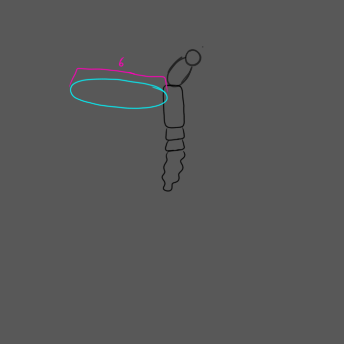 For the first elytra (hard shell that protects a beetle’s wings), draw an oval 6 units long and approximately 2 units wide slightly intersecting the top of the body.