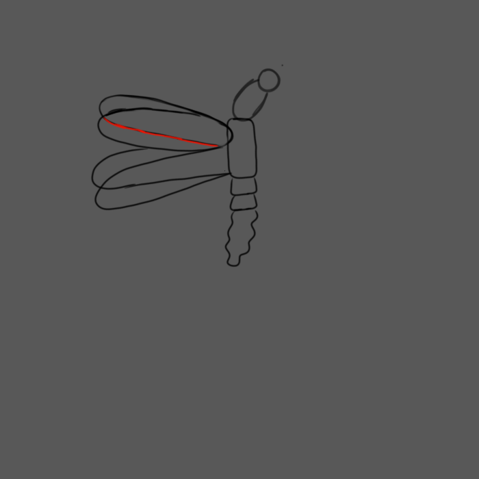 For the near wing, draw a hairpin shape 6 units long and 2 wide, connected to the body, and angled slightly down.
