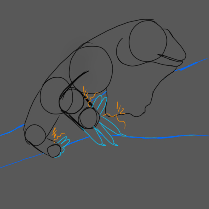 Next we draw the toes and branch. The front foot’s front facing toes are 1/2 units long, and the two thumbs are 1/3 units long. The thumbs on the rear foot are 1/4 units long. Draw two bumps to indicate the front facing toes on the back foot. Draw a branch behind the feet, it doesn’t matter what shape it is as long as both of the feet are grabbing it.