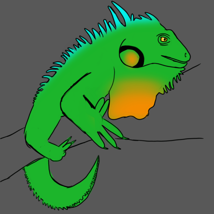 Now we are done with the line-work, so we will begin coloring. First we will color the inside of the eye yellow. Most of the rest of the body is green, with the spikes on the back being cyan, an orange circle on the cheek, and the bottom of the chin flap being orange. The colors should blend into one another.