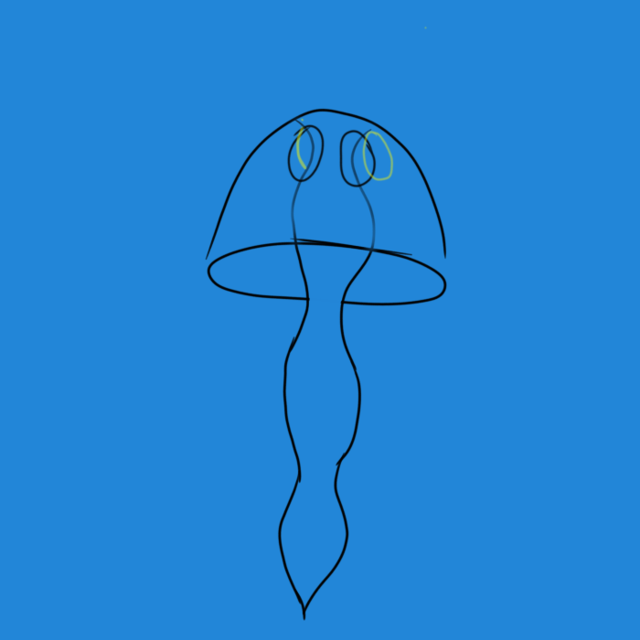 Now we draw the back of the jellyfish. Draw a curve behind the tentacle on one side and another egg further to the edge on the other.