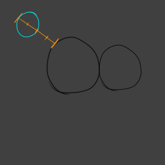 To begin let’s draw two circles. Make sure you know the diameter of the circle to the right, as we will use that for determining proportions. The left circle will be the shoulders, and should have a diameter of 1 and 1/4th unit. The circles should be touching on the sides and line up horizontally on the bottom.