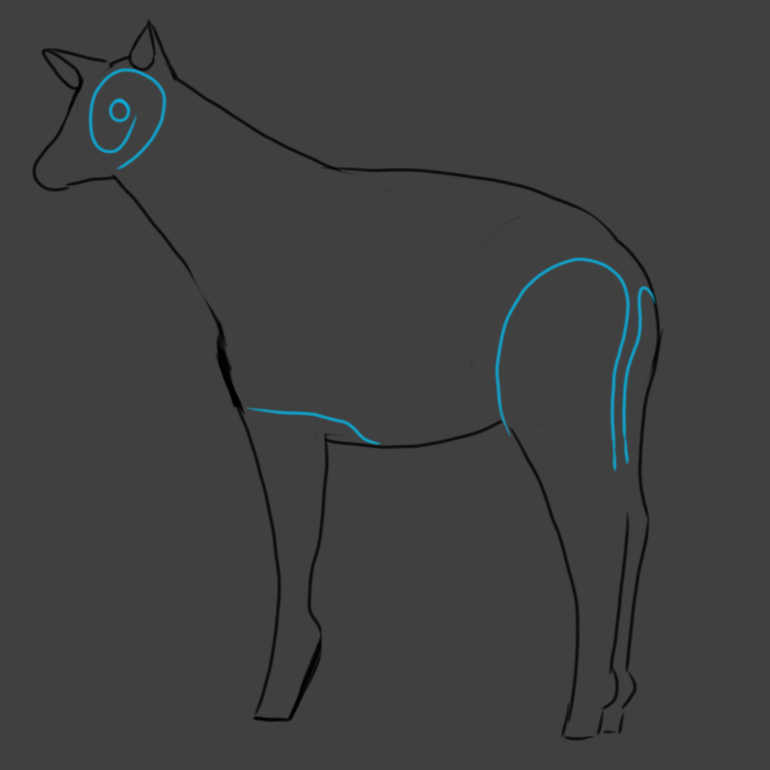On the rump, to the right of the tail draw at least 7 triangles (however many fit nicely as this also varies between individual okapis) connected to the right side of the rump.