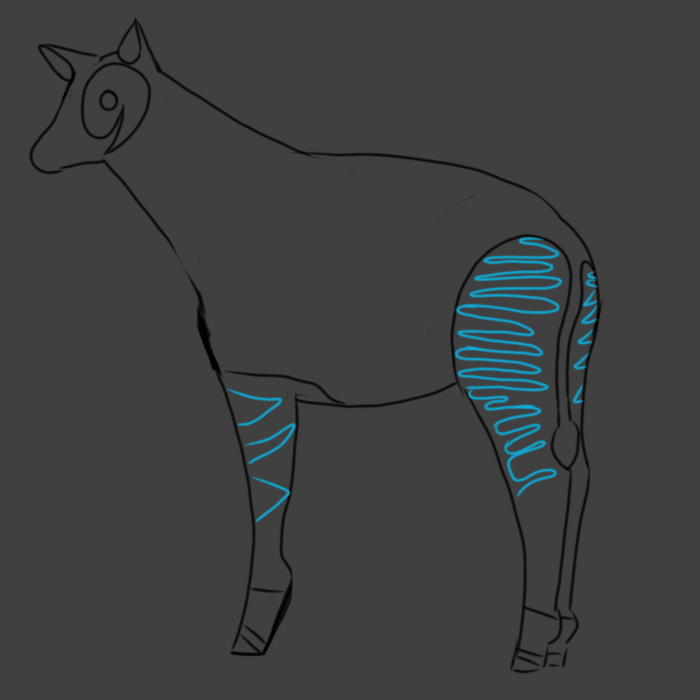 On the front legs, draw at least 3, no more than 5 triangles off the upper front part of the leg (it varies between okapis, this one has 3). Most of them should touch the other side, but not all of them have to. There should be at least a little space between the bottom triangle and the bulge on the leg.
