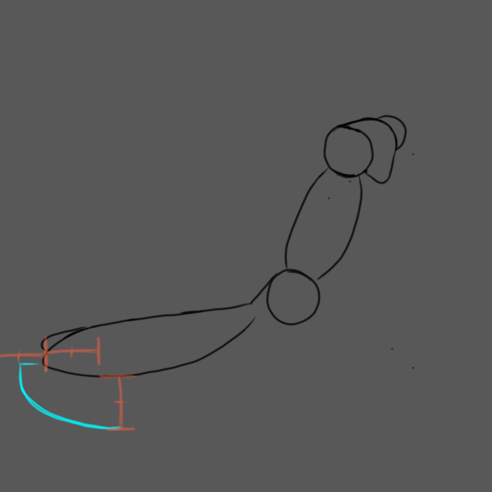 Draw the near legs. The front leg is 1&1/2 units forward and slightly more than 2 units down. The rear leg is 1 unit back and slightly more than 2 units down.