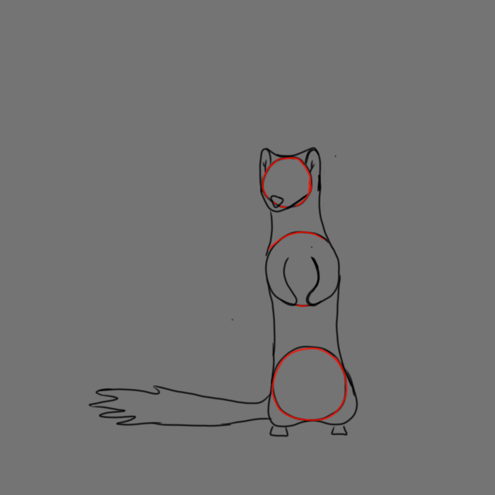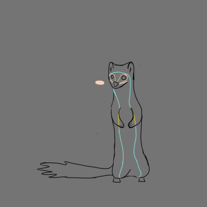 Draw a curve over the face markings, that comes straight down a little to the right of the end of the chin. Connect the curve to the right arm. Connect a second curve from the chin to the left arm. These two mirrored curves start the lines of the belly, and will continue to be mirrored on the way down. Where these lines end, create an imaginary or very light/easily erasable line that curves out tangent to the arms. Below the arms continue the curve so that the mirrored lines create a bulge in the middle of the weasel. Pinch the lines closer together again in the waist area, and end the mirrored lines with a final bulge in the haunches.