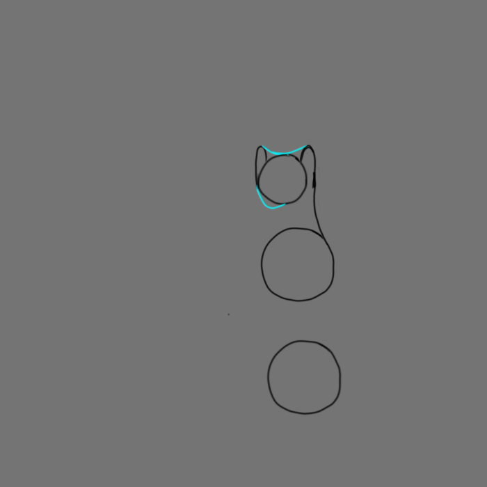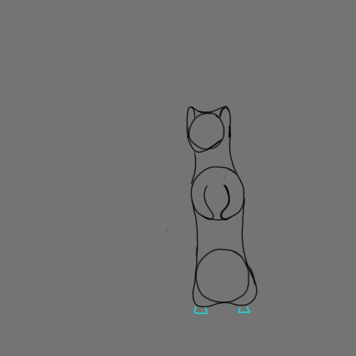 Draw two lines perpendicular to the base of each of the paws. Extend the inner part of the left haunch into the body just a little bit. Draw two 1/8th unit diameter half circles 1/4th of a unit away from each other in the face to make the eyes.