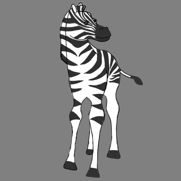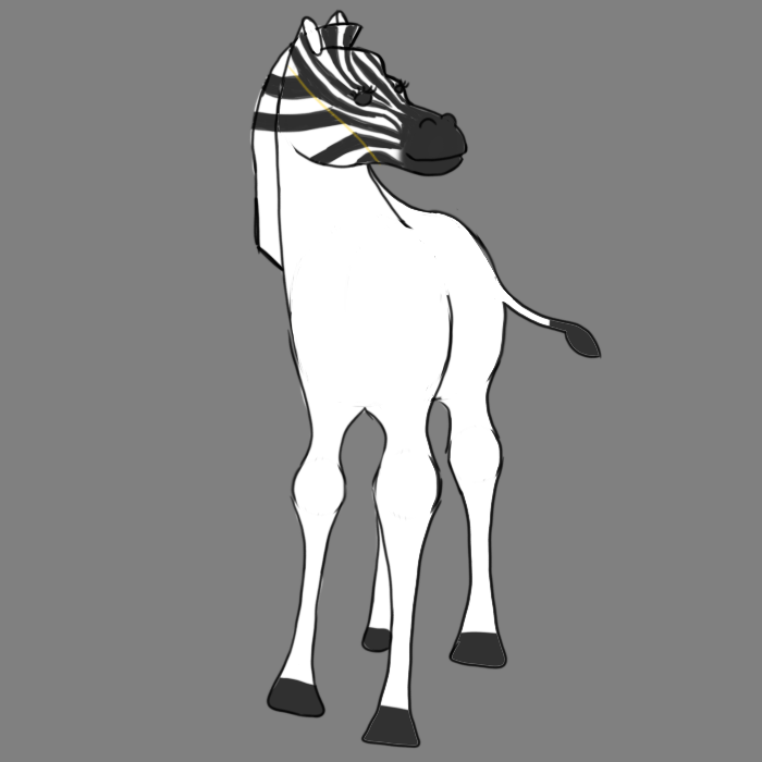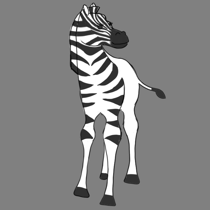 Now we begin to color. We’ll start with a white base, because turns out there is more white on a zebra than black. On the nose, hooves, tip of the tail, and inside the eyes, color it dark grey.