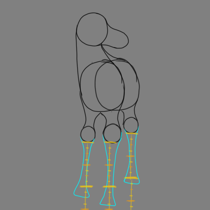 Next, begin the tail by drawing a shallow s shape off the rump. raw the ears by making two 1/4th of a unit long ovals that start just barely below the top of the head.