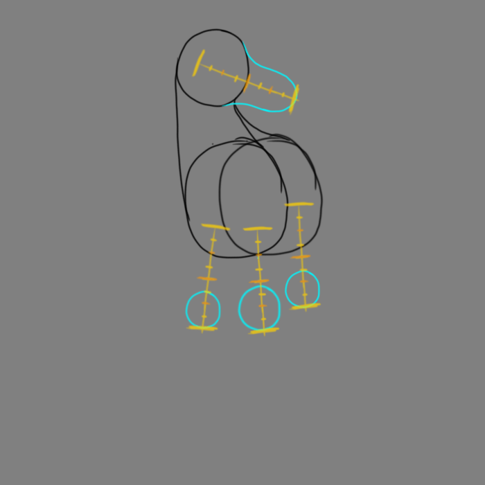 Starting at the knee of the middle leg, draw an L shape (basically half of the trumpet shapes we did last step), that is 7/8ths of a unit long.