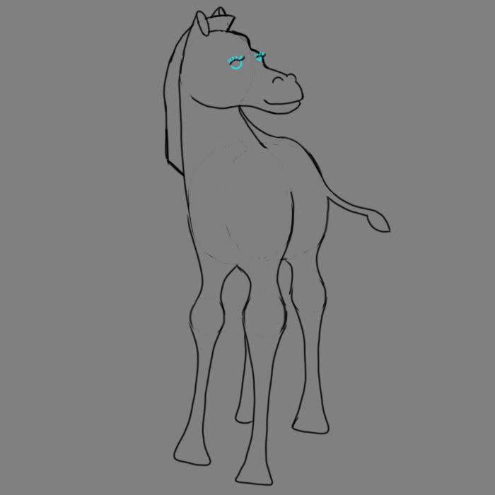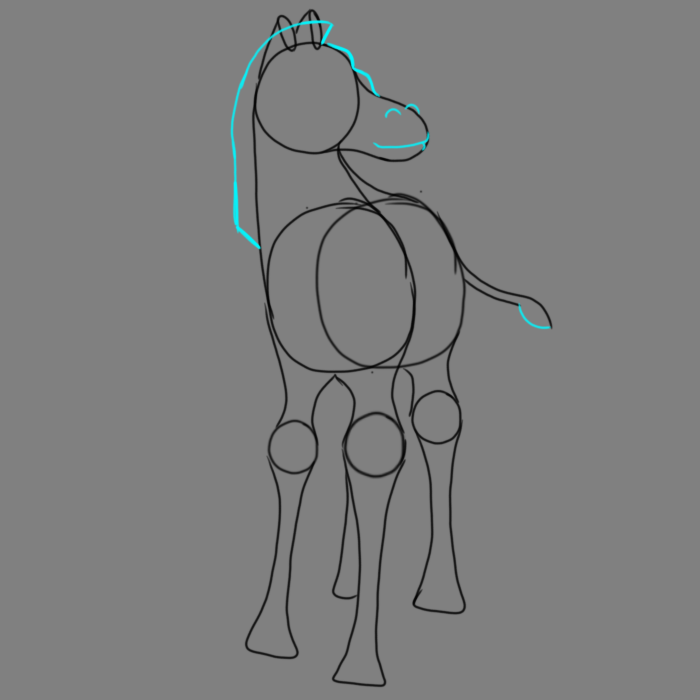 To make the mane; draw a short line from about 1/8th of a unit above where the left side of the neck connects to the body, at about a 45 degree angle. Then, from the front of the ears, draw a second short line of about the same length and angle. Draw a curve parallel to the neck/head between the tips of these lines.