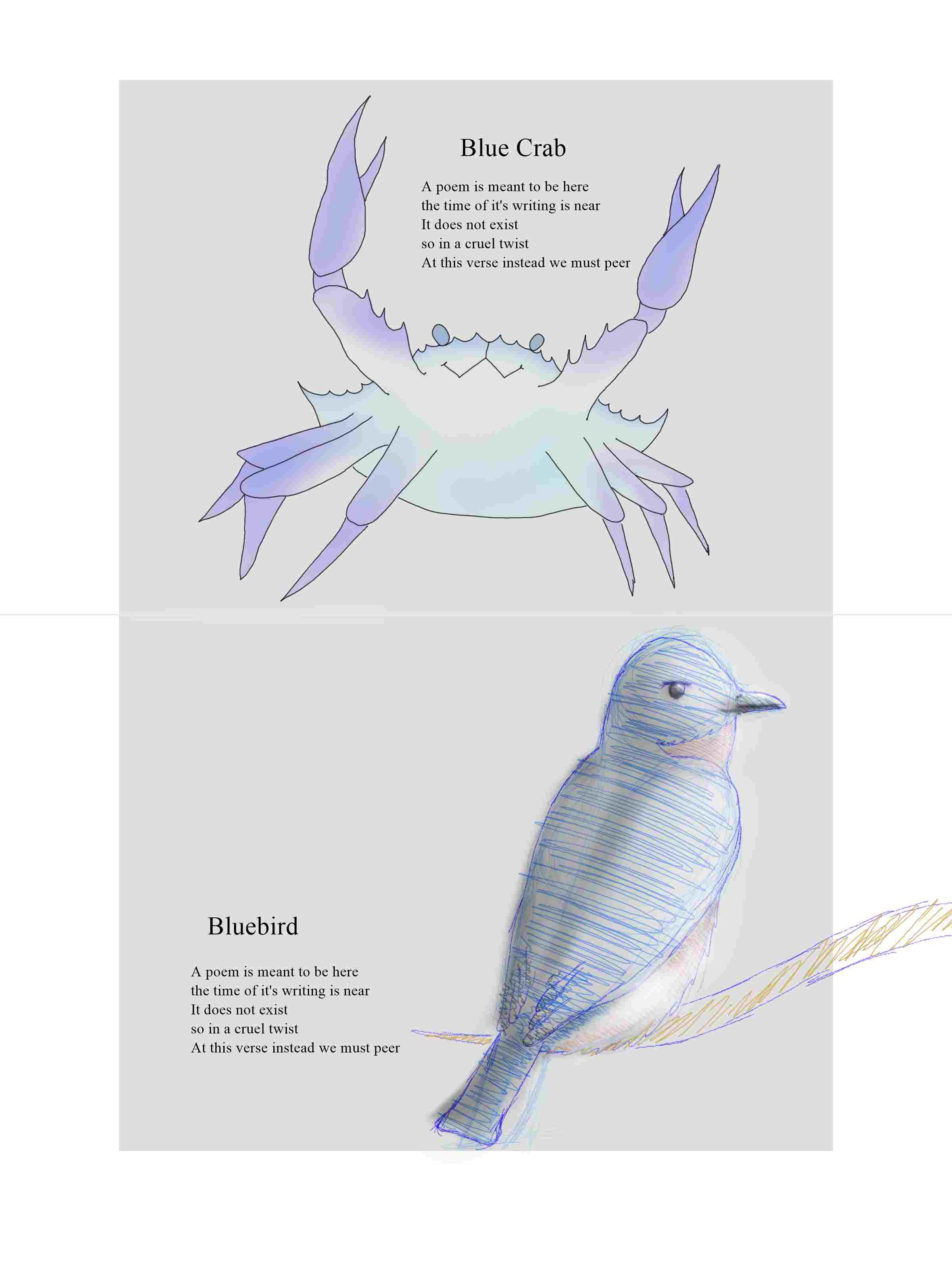 I had a lot of fun with the backgrounds as well, and was able to hide the word blue in both the blue crab’s and bluebird’s backgrounds quite well! The bluebird will be perched on a branch above a Rose-of-Sharon in front of some bushes, and the blue crab will be standing among seaweed and reaching up to catch the poem! I am very proud of this page. I think the book is starting to come together!